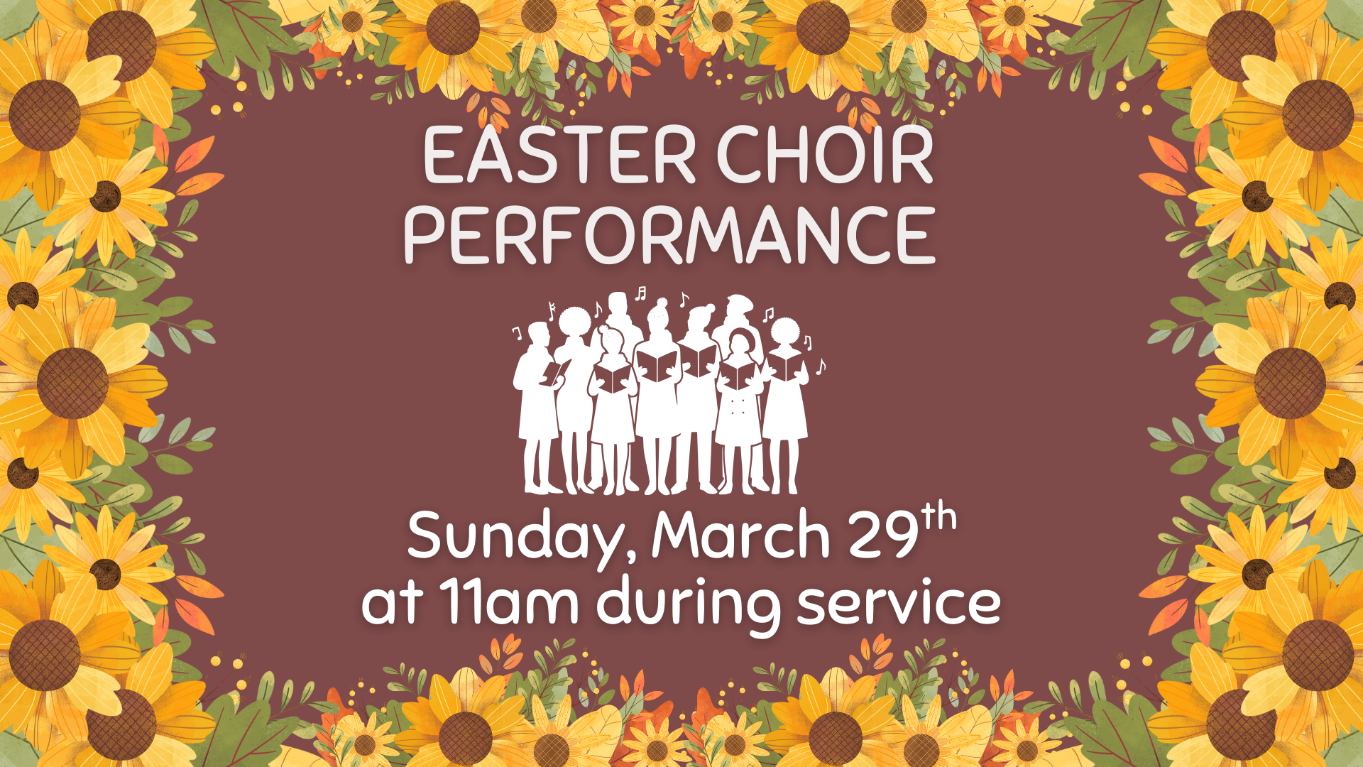 Mar 29 Easter Choir Performance Sunday, March 29, 2026 11:00 AM 12:00 PM Fifth Street Baptist Church (map) Google Calendar ICS View Event →