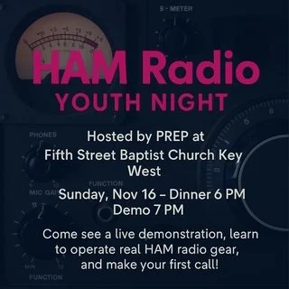Back to All Events HAM Radio Youth Night Sunday, November 16, 2025 6:00 PM 8:00 PM Fifth Street Baptist Church 1311 5th Street Key West, FL, 33040 United States (map) Google Calendar ICS